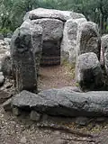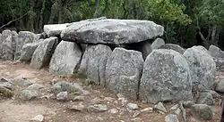The dolmen was built out of granite blocks and is dated around 2700–2200 BC. It was discovered by Pere Cama i Casas and the first mention of its uncovering was by Agustí Casas in 1894. It was later excavated by Lluís Esteva i Cruañas, who unearthed human bones and teeth, flint arrowheads, knife and pottery fragments, and necklace beads. It was partially reconstructed in the 1950s. It is seven metres long and made up of an entrance passage into the funeral chamber, with a circular tumulus that is 11 metres in diameter.[2] The entrance to the tomb is oriented to the southeast, which allows sunlight to reach the interior on the winter solstice.[3]