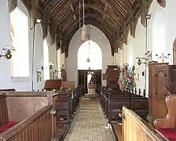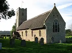 The Church of England parish church of St Lawrence is in the centre of the parish alongside the B1127. It possibly dates from the late Saxon period[5][38][39] and may have been included as one of the two churches listed at Frostenden at the Domesday survey.[40] It is certainly Norman at the latest, with a 12th-century nave with original doorways and a chancel that dates from the 14th-century. It has a thatched roof and a tall, flint-built tower which dates from the 15th-century. Windows in the nave date from as early as 1300 and a piscina in the chancel has been dated to the 13th-century.[5][17][40][41]