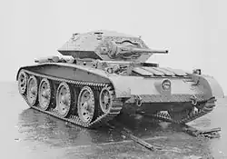 The initial specification required a QF 2 pounder gun, at least one machine gun, the same A13 Christie suspension in a lower hull, epicyclic steering transmission and "armour standard" (armour basis) of 30 millimetres (1.2 in).[5] The "30 mm armoured standard" referred to any vertical plate having to be 30 mm thick. Angled surfaces (through the principles of sloped armour) could be thinner, provided they were at least as effective as a 30 mm thick vertical plate.[6]