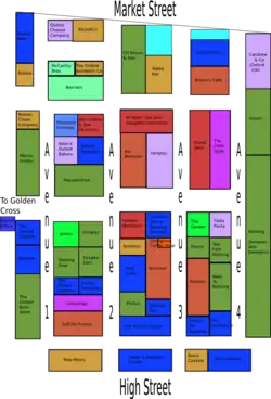 The market is located to the north of the High Street towards the western end between Cornmarket Street and Turl Street. To the north is Market Street. Most of the entrances are from the High Street and Market Street (with four entrances from each street). It is also possible to gain access from Cornmarket via the Golden Cross alley, with its small up-market shops.