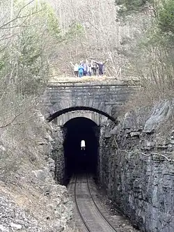 Construction on the tunnel began in 1849 and was completed in 1852 with the tracks completed in 1853. Work was undertaken by slaves, Irish immigrants, and local workers with Swiss engineers. Three ventilation shafts approximately 170 ft (52 m) deep were created during the construction to facilitate air circulation, provide additional work areas, and to enable evacuation of steam and smoke from the steam locomotives during use. The importance of the tunnel was recognized during the American Civil War with both sides fighting over but never destroying the tunnel. The use of the tunnel continues today with freight trains frequently running through it.[2]