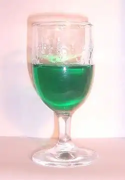 Crème de menthe (pronounced [kʁɛm də mɑ̃t], French for "mint cream") is a sweet, mint-flavored alcoholic beverage. It is available commercially in a colorless version (called "white") and a green version (colored by the mint leaves or by added coloring if made from extract instead of leaves).[1] Both varieties have similar flavor and are interchangeable in recipes, except where color is important. It is usually made with Corsican mint or peppermint, which is steeped in grain alcohol for several weeks before it is filtered and sweetened to create the final product. It typically has 25% alcohol by volume.