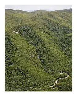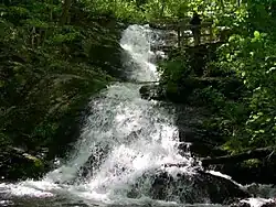 Fed by the Crabtree Creek upstream and draining into the Tye River downstream, the set of waterfalls which encompass the whole of Crabtree Falls are often credited with being 1,200 feet (370 m) high, but topographic maps show the total drop to be closer to 1,000 feet (300 m).[1] Crabtree Falls is a series of cascading waterfalls, with five major cascades, the tallest of which drops about 400 feet (120 m), and several smaller cascades, all over a total distance of approximately 2,500 feet (760 m) horizontally.[1] The cascade with a 400-foot (120 m) drop also gives Crabtree Falls the title of tallest vertical drop in a waterfall east of the Mississippi River. However, the title of tallest free-fall vertical drop goes to Fall Creek Falls in Tennessee's Fall Creek Falls State Park.