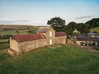 Expanding his landholdings around Cragside, Lord Armstrong acquired Cragend, a nearby 16th-century farmhouse[7] two miles south of Rothbury.[8] He started work on modernising the farm in the 1880s,[8] and around 1895 built the experimental hydraulic silo building now known as Cragend Silo. The design is believed to have been influenced by a French system that Armstrong studied, and was intended to improve the efficiency of processing cut grass into silage.[1] Despite the innovative design, the procedure required a great deal of manual labour: this, coupled with issues caused by fumes emanating from the fermenting grass, led to the silo's abandonment after a short period of operation.[9] Blackburn Lake, which provided hydraulic power for the machinery, was drained around 1930.[1]