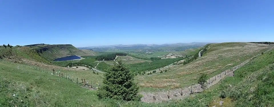 Craig y Llyn (Welsh for 'rock/cliff of the lake') is a mountain situated to the south of the village of Rhigos in the Cynon Valley on the south side of the upper Vale of Neath and north of the Rhondda Valleys in South Wales; it is the highest point in the ancient kingdom and, later, county of Glamorgan (Morgannwg), and the southern Welsh coalfield plateau.
