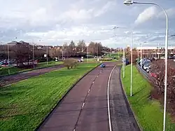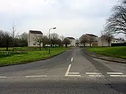 The design of Craigavon was based on Modernism and imbued with the spirit of the age.[6] The design team was headed by the Scottish architect James Moffatt Aitken, formerly Chief Architect to the Ministry of Health and then Chief Planner for the Ministry of Development in Northern Ireland.[11] The plan separated motor vehicles from pedestrians and cyclists wherever possible, creating a network of paths allowing residents to travel across Craigavon without encountering traffic. The road network for motor vehicles used roundabouts instead of traffic lights at junctions, giving the planners the ability to easily increase the number of lanes if it became necessary. Electricity and other cables were placed underground and street lighting was standard throughout. The planners clustered the housing developments around small 'village centres' with associated retail space, leisure facilities, post offices, primary schools, pharmacies, community centres and other civic amenities. All estates were built with security in mind, with one vehicle entry/exit point. Single-use zoning was part of the design; there was a total separation of industrial land-use from all other uses.[12]