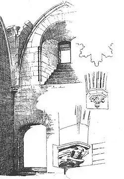 The ruins stand upon a knoll rising out of a plateau, between what appears to have been two marshes or lochans, and the ditches were originally cut between them. One ditch cuts the ridge 117m NE of the castle to form an outer bailey. The castle would have been effectively isolated from the 'mainland', and a significant barrier raised by the water to any potential besiegers at the period when the use of gunpowder was unknown. Two crumbling gables, portions of walls, and shreds of battlements remain, and in the 19th century several underground vaulted chambers survived, although partly filled with rubbish, and home to foxes and bats.[14] The entrance to the castle was at the south-west side by a drawbridge,[15] of which the abutment still survives.[16] The entrance pend or arched passage had a circular watch-tower or bastion to defend it. Within the closing wall was a courtyard surrounded by buildings, and from this courtyard there was an entrance into the great hall, long blocked up.[17]