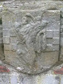 An armorial plaque from the castle ruins[15] is set in the wall of the steading (NS 4 062 3174). The naive peasantry at one time believed that the stone showed two wild men playing at draughts.[27] It bears the impaled arms of the Lindsays and Wallaces.