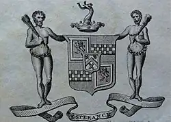 Those of Sir John Alexander Wallace were quarterly : first and fourth, Gules, a Lion rampant, Or, within an Orle; second and third, Gules, a fesse Cheque of three, Argent and Azure. The Supporters were two savages, proper, with Clubs erect. The family crest was an Ostrich neck and head erect, issuing out of an open crown, with a horseshoe in the mouth. The motto was Esperanza, Spanish for 'Hope'.[49]