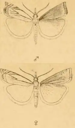 The wingspan is 18–23 mm. The forewings with apex slightly produced; yellow-ochreous, posteriorly with whitish interneural streaks edged with dark fuscous; a suffused white dorsal streak; a broad white median longitudinal streak, edged with dark fuscous, reaching costa until near middle, cut by an oblique dark brown line beyond middle, and usually by an ochreous subcostal line; second line angulated, silvery-white, preceded and followed by triangular white costal spots; some black terminal dots; cilia metallic. Hindwings are whitish, towards apex suffused with grey.[3] See also Parsons et al.[4]