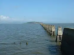 Cramond Island is a tidal island about one mile (1.6 km) out to sea, which is connected to the mainland at low tide across the Drum Sands. A paved path, exposed at low water, allows easy access. This causeway runs at the foot of a row of concrete pylons on one side of the causeway, which were constructed as an anti-boat boom during the Second World War and are one of the most striking sights in the area. At high tide the path is covered by several feet of seawater which cuts the island off from the mainland. It is safe to walk along the raised causeway to the island at low tide, but only if visitors ensure that they leave enough time to return to the mainland before the water rises. The speed at which the tide comes in can easily trap the unwary. A large signpost (located at the start of the causeway) warns visitors of the danger.[3] If this warning is ignored, there can be serious accidents[4] or people may be stranded on the island until the next low tide.[5][6][7] In 2011, a Daniel Defoe of Livingston, West Lothian and an unidentified female found themselves trapped on the island due to miscalculating the times of the tide. This story gained attention due to the ironic parallels with Robinson Crusoe; a novel written by Daniel Defoe published in 1719.[8] Coastguards recommend that the crossing is only attempted during the two hours either side of low water. On the RNLI (Royal National Lifeboat Institution) Queensferry website, there is a list of “safe crossing times” and it states that the “times are given as a guide and may change due to weather and conditions. Times listed in BLACK are the first safe crossing time and those listed in RED are when to be back on the mainland”.[9]