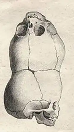 | Drawing of a skull of a child born in 1783 in Bengal, affected by craniopagus parasiticus |