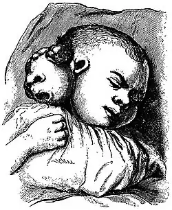 Craniopagus parasiticus is an extremely rare type of parasitic twinning occurring in about 4 to 6 of 10,000,000 births.[1] In craniopagus parasiticus, a parasitic twin head with an undeveloped body is attached to the head of a developed twin. Fewer than a dozen cases of this type of conjoined twin have been documented in literature.