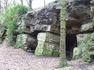 Crank Caverns[1] is the common name of the remains of the Rainford Delph Quarry near Crank in St. Helens, Merseyside, England. It is a vast network of old tunnels and caverns, with very little known about the owners or workers of the tunnels. It appears that the main portals are much newer than the deeper tunnels found behind the tight squeeze through the gated entrance.[2] Information in the St. Helens local history archives states that sandstone quarrying began here as early as 1700. The 1840s Ordnance Survey refers to the quarry as Rainford Old Delph. The woodland surrounding the caverns was used as a game reserve by the Earl of Derby until 1939, when they became a storage facility for ammunition for the anti-aircraft position at Crank. Today, Crank Caverns are still physically accessible from a nearby public footpath, but is on privately owned land and is technically trespassing. It is still a draw for generations of curious locals who wish to explore, many having heard the numerous local myths and legends from an early age.[3]