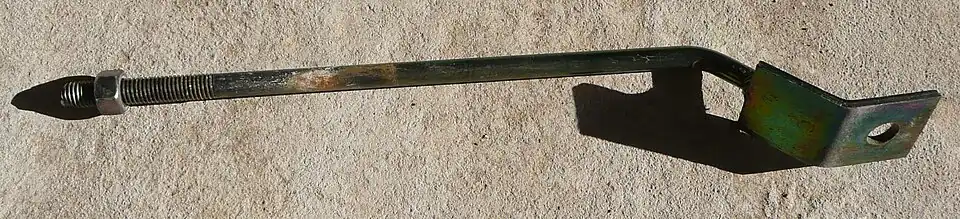 A cranked eye bolt is an eye bolt typically used as a structural tie down[1] in building construction where the eye of the bolt must be fastened to a point that cannot be directly below where the shaft would otherwise be fastened. This often occurs where a bearer must be tied down to a post or column but the bearer cannot be directly fastened to the post of column.