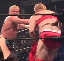 When the WWF was renamed World Wrestling Entertainment and divided into two Raw and SmackDown! brands, Holly was assigned to the Raw roster, where he had little success.[24] He jumped ship to SmackDown! on the September 2, 2002, episode of Raw during a match with Jeff Hardy. Earlier, Raw General Manager Eric Bischoff was informed that a Raw wrestler would leave to reunite with a relative on SmackDown!, and ordered a beatdown by 3-Minute Warning on Hardy, who he wrongly suspected of planning to join his brother, Matt Hardy, until Crash revealed that he was the one who was leaving, planning to join his cousin Hardcore Holly on SmackDown!.[25] In his first SmackDown! match, on September 5, he defeated The Hurricane.[26] He then feuded with Cruiserweight Champion Jamie Noble. On the October 3 SmackDown!, Noble defeated Holly to retain the title.[27]