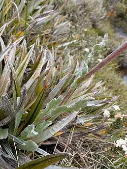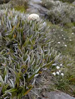 Craspedia macrocephala, commonly known as Alpine billybutton,[3] is a species of flowering plant in the Asteraceae family that is widespread and endemic in subalpine and alpine areas of Tasmania.[4] It is a robust herb that produces a single flowering scape with a conspicuous, almost spherical head of densely packed white florets that bloom from January-March.[5]