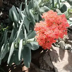 It has inflorescences of brilliant profusions of scarlet blossoms in the summer, unlike many other Crassula species which are winter-blooming. The flowers are densely arranged in a rounded inflorescence on a long peduncle up to 100 mm high. The bright red or pink color of the tubular flowers can also turn to almost white, they can be up to 7 mm long. The seeds are rather small.[4]