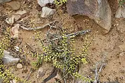 Crassula subaphylla is a small, dense to sparse, straggly shrublet, consisting of numerous brownish stems and branches, 15 – 30 cm tall (up to 60 when scrambling in vegetation). Branches are wiry, woody, but thin and brittle, twiggy (usually decumbent), with flaking strips of bark. Younger branches are slightly velvety (puberulous), reddish-brown, carnose. The leaves are widely dispersed along the branches with internodes of 0.5 — 1 (-3) cm, variable in shape, hairiness and colour (greyish- or reddish-green to yellow-green), distinctively pointed/conical (lanceolate-linear), and easily break off, 5 – 23 mm long and 4 – 8 mm in diameter. It flowers in spring to mid-summer with thyrses up to 8 cm tall with numerous dichasia. The flowers are cream with brown anthers, tubular, panduriform, to 5 mm, have distinctively recurved membranous wings on both sides of the petal tips.[2][3]