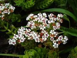 The flowers are white that tend to be hinted with pink or red sepals, with red ovaries coloring the center of the flowers, and red anthers that turn golden. The flowers are sorted in cloaked clusters, jammed at the branches' ends, with nectar that exudes a distinguishing scent. The flowers become small capsules (fruit), each comprising many very small seeds.[3]