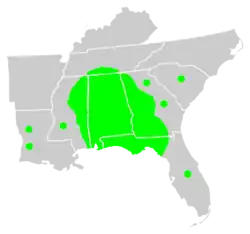 Crataegus pulcherrima is native from eastern Mississippi east to Alabama and western Georgia, north to south-central Tennessee and south to the Florida Panhandle. It has been reported in Louisiana and South Carolina.[5] Crataegus pulcherrima occurs naturally in mixed upland hardwood and pine forests, often in rich, sandy soils.[6]