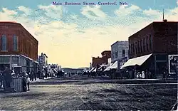 A second railroad, the Chicago, Burlington and Quincy, reached Crawford in 1889, providing an additional boost to the community.[9] In 1907 Crawford became a city, and by 1911 Crawford had the seventh-most business volume in Nebraska. Through the following years, the town had a variety of industries, including a brick works, mica mill, pickle factory, and a Nash Finch Company warehouse. Crawford lobbied for a state normal school, but the state decided to place the school (now Chadron State College) in nearby Chadron. The state thought that Crawford's proximity to Fort Robinson would not be good for the school's young women students.[5][6]