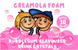 Creamola Foam came in the form of coloured crystals which were dissolved in cold water to form a sweet, fizzy drink. It was packaged in a small tin labelled with a cartoon girl and boy drinking with straws.