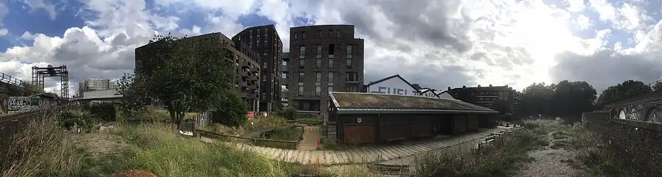 The Creekside Discovery Centre is a 0.5-hectare (1.2-acre) natural habitat in Deptford in the London Borough of Lewisham. It is owned by the National Grid and managed by the Creekside Education Trust. Formerly a gas works,[2] the centre is a brownfield habitat incorporating the only existing sloping beach into Deptford Creek.[3] Other habitats on the site include a pond, constructed in a project coordinated by the Creekside Education Trust in partnership with Lewisham College,[4] and a sandbank, built in 2001.[5]
