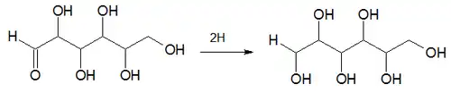 The Creighton process involves the hydrogenation of a 6 carbon chain aldehyde.[1][2] The reactant is 2,3,4,5,6-pentahydroxyhexanal (an aldehyde) and the product is 1,2,3,4,5,6-hexanehexol (an alcohol). The product thus has two more hydrogen atoms than the reactant: -CHO is replaced by -CH2OH.