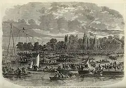 The property was sold by the Dawson family, Barons Cremorne, in 1831 to a Baron de Berenger,[3] who was a convicted fraudster whose real name was Charles Random. De Berenger converted the site into a sports facility, called The Stadium, and became a proponent of self-defence techniques.[4] The business failed in 1843, but not before de Berenger had added some attractions of pleasure gardens of the time, including hosting a balloon ascent in 1838. For two years the gardens opened for summer, including an opening festival billed as "Pie de Nie" with Balloon ascent,[5] for instance, were held, and the property was sold in 1845. James Ellis took over the license in January 1845.[6] The twelve-acre site was then developed by James Ellis into a proprietary place of entertainment and spectacle, being popular as such from 1845 to 1877. The Cremorne Gardens occupied a large site running between the Thames and the King's Road. Opened in 1845, they were noisy and colourful pleasure gardens featuring restaurants, entertainments, dancing and balloon ascents, and could be entered from the north gate on Kings Road or another by the Cremorne Pier on the river.