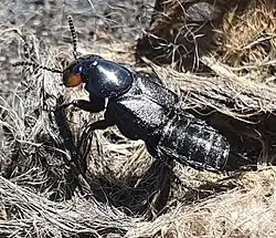 At approximately 20 mm in length, Creophilus oculatus is the largest of the over 1000 species of rove beetle found in New Zealand.[7] It is elongate, black, and shiny, with reduced elytra characteristic of the Staphylinidae, covering one third of its abdomen. Despite its reduced wing covers it is a strong if reluctant flier, preferring to escape by running with the abdomen curled over its back, and when flying is attracted to lights.[7][9] The orange-red 'spots' behind the eyes distinguish Creophilus oculatus from all other Creophilus species (except rarely C. huttoni).[4]
