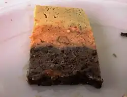 The dish is usually baked and inverted. It comprises a minimum of three or four layers of different colored omelettes, often given by red tomatoes, orange carrots, green spinach or chard, and black olives. Peppers, with their variety of colors also allows for multicolored crespéou. Some preparations use sausage or sliced fish for a beige layer. In Nice, there is always an omelette made from chard ribs.[1] Other vegetables can be used, such as zucchini, eggplant, onion, or basil.[3]