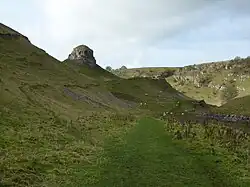Peter's Stone (named after its resemblance to the dome shape of St Peter's Basilica in Rome) is the prominent limestone knoll at the northern end of the valley (the Wardlow Mires). It used to be called Gibbet Rock where the last gallows in the county once stood. The gibbet was an iron cage holding the dead bodies of executed criminals as a deterrent to others.[5] One of the last cases of gibbeting was of Anthony Lingard from Tideswell in 1815. He was convicted and executed in Derby for killing Hannah Oliver, the toll-keeper at Wardlow Mires, for a pair of red boots. His corpse was hung in chains on Peter’s Stone.[6]