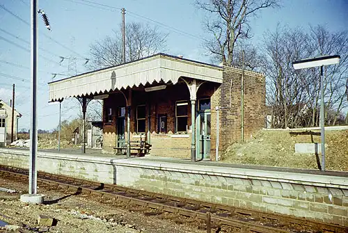 There was originally a signal box on the platform, next to the level crossing. This was removed and relocated to the preserved Colne Valley Railway at Castle Hedingham in the 1970s.