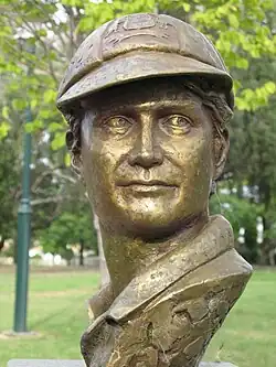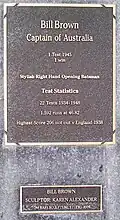 The nearby statue by Valerius[2] (shown below) of Bradman in action was unveiled during the celebrations for "Sir Don"'s 92nd Birthday in August 2000.[3] A minor mystery surrounds the Brian Booth sculpture, similar in style to others by Valerius, but not credited in the official documentation. There is no obvious clue in the plaques, which have remained uniform in style and execution over 30 years.