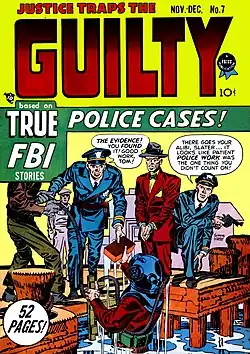 The series remained essentially alone in its choice of subject matter for most of the 1940s but eventually inspired a host of imitators, including Jack Kirby and Joe Simon's Headline Comics and Real Clue for Hillman Periodicals (1947), Marvel's Official True Crime Cases (1947), DC's Gang Busters (1947), and Fox's Crimes by Women (1948). In response, Gleason and Biro ran attack ads in their own comics and launched a companion title to Crime Does Not Pay, called Crime and Punishment, in 1948. However, 1948 also saw more publishers enter the genre, with the result that, by one estimate "thirty different crime comics were on the stands by the end of 1948 and by 1949 roughly one in seven comics was a crime comics."[7]