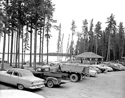 Crimson Lake received its name from the striking colours of the setting sun reflecting on the surface of its waters seen by an earlier trapper.[1] It is a small, clear, shallow lake set in the meeting spot of foothills pine forests, aspen parkland, bog and muskeg ecosystems.[2] Located on the northeast shore of the lake is Pioneer Ranch Camp, a Christian summer camp within the park's boundaries.[1]
