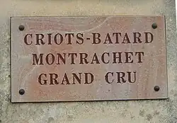 Criots-Bâtard-Montrachet is an Appellation d'origine contrôlée (AOC) and Grand Cru vineyard for white wine from Chardonnay in the Côte de Beaune subregion of Burgundy. It is located within the commune of Chassagne-Montrachet.[1] Criots-Bâtard-Montrachet borders on the Grand Cru vineyard Bâtard-Montrachet in the north, on the Chassagne-Montrachet Premier Cru vineyard Blanchot Dessus in the west and on village-level Chassagne-Montrachet vineyards in the south and east. The AOC was created in 1937.