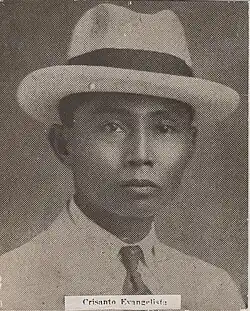 Crisanto Abaño Evangelista (November 1, 1888 – June 2, 1942) was a Filipino communist politician and labor leader of the first half of the 20th century. He is credited as being one of the founders of the Partido Komunista ng Pilipinas. Evangelista was also an influential head of the Congreso Obrero de Filipinas, at the time the foremost and largest trade federation in the Philippines, having served as secretary for multiple years. He also headed the Union de Impresores de Filipinas as its Secretary-General. Prior to forming the PKP, Evangelista was a member of the Partido Obrero de Filipinas, a Filipino workers' party with increasingly radical leanings. Evangelista was eventually captured by the Japanese during the Second World War and executed.