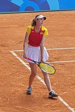She made her Olympic debut in Paris, where she reached the second round in singles with a win over Petra Martić.[66] Seeded eighth in doubles with Sorribes Tormo, they won the bronze medal.[67] Following her bronze medal win, she became the first female and first athlete to be commemorated on the Paseo Torre de la Vega in her hometown of Torrelavega.[68][69] At the China Open, she reached the fourth round of a WTA 1000 tournament for the first time in her career, defeating wildcard Yao Xinxin, and upsetting 11th seed Liudmila Samsonova and 24th seed Elise Mertens.[70][71]
