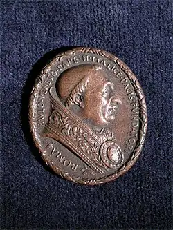 After Trevisan died in 1465, Cristoforo was employed by the papal court.[2] Pope Paul II employed Cristoforo di Geremia as his primary medallist. Pope Paul II is considered the first pontiff to realize the potential of medals as an instrument of the state and for personal propaganda. Because of this, he had more medals produced than any other 15th century Pope.[4] While in service to the Pope, Cristoforo primarily produced variations of two different medals. The first was oval shaped and made to commemorate his pontification and political shrewdness. The second medal was circular and was produced to recognize his various campaigns at the Palazzo San Marco. One side has Pope Paul II's profile. The inscription on it reads "PAVLO VENETO PAPE II - ITALICE PACIS FVNDATORI - ROMA", which translates to "Pope Paul II Venetian - Founder of the Peace of Italy - Rome". The back shows Pope Paul II's coat of arms, from his status as the Venetian cardinal Pietro Barbo, and includes a rampant lion, the papal keys, and a tiara. The medal was produced in conjunction with the pope's announcement of peace in the Basilica of San Marco on April 25, 1468. Versions of the medal were most likely distributed to notable attendees of the event as well as sent to secular rulers of the peninsula. As with many of Cristoforo's works, this papal medal has components inspired by antiquity. There is evidence that the profile side of the medal resembles the denarius of Emperor Hadrian. The inscription assimilates Pope Paul II to Augustus stemming from the inherently imperial nature of the peace proclamation in 1468.[4]