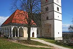 The church's artwork includes a painting of Holy Sunday from the workshop of Johannes of Ljubljana (c. 1460), a Gothic painting of Saint Christopher on the south wall from 1464, a painting of Saint Christopher on the bell tower, and remnants of frescoes from the 14th and 15th centuries on the north wall of the nave. There are four 17th-century gilded altars where the nave meets the chancel; above the altar dedicated to Saint Martin there hangs a whale rib, referred to as the rib of a giantess in popular tradition. The main altar was created in 1652 by the Ljubljana sculptor Jurij Skarnos and was gilded by Jakob Jamšek of Škofja Loka. The forged railing in front of the main altar was created by the Škofja Loka locksmith Gregor Jesenko.[5] The Baroque organ, work by the organ builder Joannes Franciscus Janecheck, dates to 1743.[13]