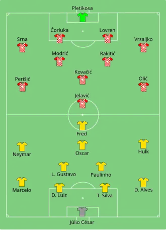 Croatia opened the scoring through a Marcelo own goal, as the ball bounced off him into the net after Nikica Jelavić deflected Ivica Olić's cross.[15] Neymar equalised for the hosts with a 25-yard (23 m) shot after receiving a pass from Oscar.[16] In the second half, Brazil took the lead with Neymar's penalty after Dejan Lovren was judged to have fouled Fred in the penalty area.[16] Croatia had a potential equaliser disallowed, after a foul was called on the Brazilian goalkeeper, Júlio César.[17][18][19] In added time, Oscar sealed the win, toe-poking the third goal for Brazil from 22 yards (20 m) after receiving a pass from Ramires.[16]