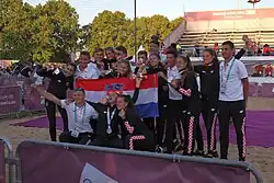 female and male Beach handball teams of Croatia celebrating the girls silver medail