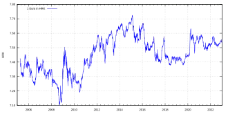 A long-time policy of the Croatian National Bank was to keep the fluctuations of the kuna's exchange rate against the euro (or, previously, the mark) within a relatively stable range. Since the introduction of the euro in 1999, the exchange rate between the two currencies rarely fluctuated to a substantial degree, remaining at a near constant 7.5:1 (HRK to EUR) rate. Croatia joined the European Union on 1 July 2013 and the Exchange Rate Mechanism on 10 July 2020 at a rate of 7.53450 HRK to €1.[11][12]