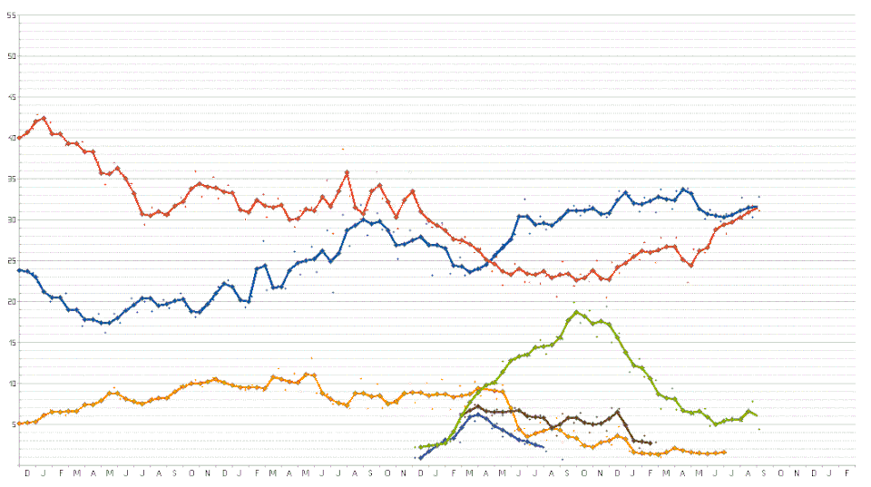 15-day average trend line of poll results from December 2011 to the present day, with each line corresponding to a political party.