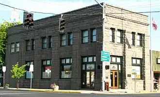 The Crook County Bank is located on the southeast corner of Third and Main Street in Prineville, Oregon.[7] It is a two-story Romanesque-style building. It was constructed in 1910 using stone blocks from a local quarry located west of the Ochoco Viewpoint. This is the same quarry that provided the stone used to build the Crook County Courthouse in 1909.[3][8]