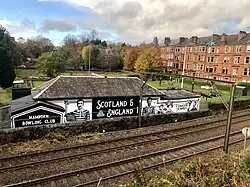People travelling on the Cathcart Circle Line railway pass a commemorative mural on the wall of the Hampden Bowling Club, commemorating Scotland's 5-1 win over England at the site of Glasgow's first Hampden Park. The mural, by Glasgow-based artist Ashley Rawson, can also be viewed from the nearby Cathcart Road.[9]
