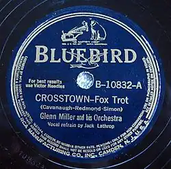 "Crosstown" was released as an RCA Bluebird 78 single in 1940 by Glenn Miller and His Orchestra featuring Jack Lathrop on vocals. The single reached no. 9 on the Billboard pop singles chart in a single-week chart appearance.[1] The B side was "What's Your Story, Morning Glory?"