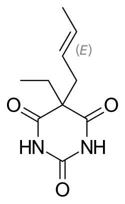 Crotylbarbital (Mepertan, Kalipnon, Barotal), also known as crotarbital, is a barbiturate derivative developed by Eli Lilly in the 1930s.[1] It has sedative and hypnotic effects,[2] and was used for the treatment of insomnia until it was replaced by newer alternative drugs with fewer side effects and lower risk of overdose.